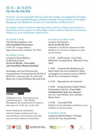 “Hans Winkler, Kurt Lanthaler, Martin Hanni (Hrsg.): Franz Held. Vordadaistische Texte aus Jenesien”. Frankfurter Buchmesse, 2012 (von: aufdraht). Veröffentlicht: 2012. Genre: Diskussion/Gespräch