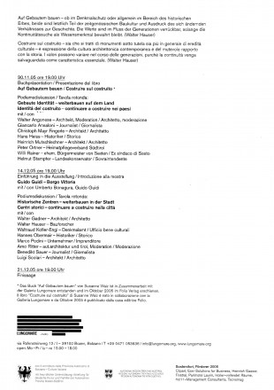 Nei luoghi che ospitano la mostra si organizzano serate di discussione che vanno a sondare la tradizione architettonica e costruttiva locale: nel confronto tra le regioni a nord e a sud delle Alpi si evidenziano non solo particolarità e differenze nella tutela del patrimonio architettonico ma anche approcci e sensibilità diverse da parte degli architetti e della committenza. Cosa determina il ritmo del mutamento in un paese o in una città, sono il benessere e il turismo o sono mutate le esigenze? Il cambiamento avviene nell’interesse dell’individuo o è condiviso socialmente? Quali ruoli ricoprono a tale proposito le normative e le prescrizioni urbanistiche?
