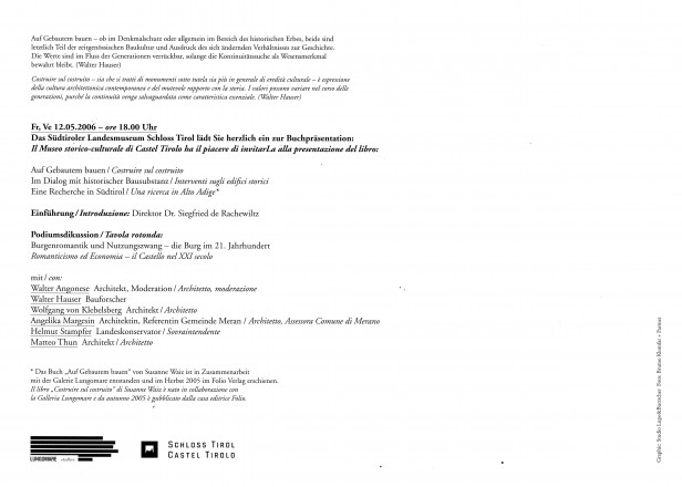 “Costruire sul costruito” è una pubblicazione dell’architetto Susanne Waiz in collaborazione con la Galleria Lungomare ed edita dalla Casa Editrice Folio. In occasione della presentazione del libro Lungomare insieme all’autrice del libro organizza una mostra itinerante in varie città in Austria, Germania e Italia.
