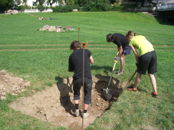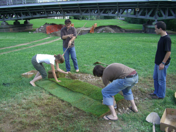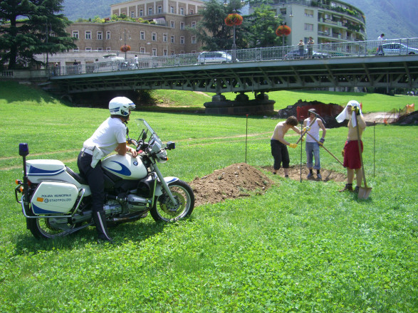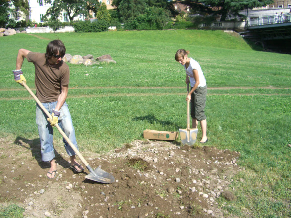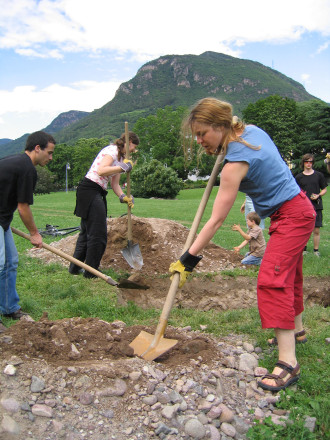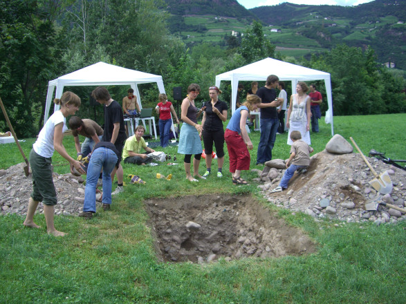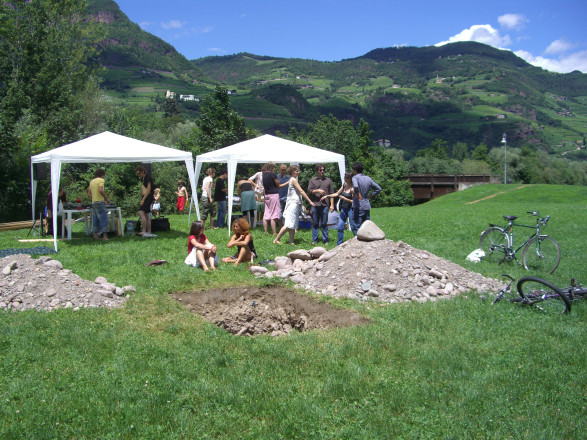 During a three-day action the Viennese cooperative, Effektiv will dig a pit on the Talvera fields. A ladder will be left in the pit as soon as its predetermined depth has been reached. The performance wants to provoke associations evoked from the image of a building site, an earth sculpture, and an unusable hole, and allows for passersby to make their own personal definitions of the installation. The group Effektiv creates an irresolvable relationship between the object of the ladder and a hole.