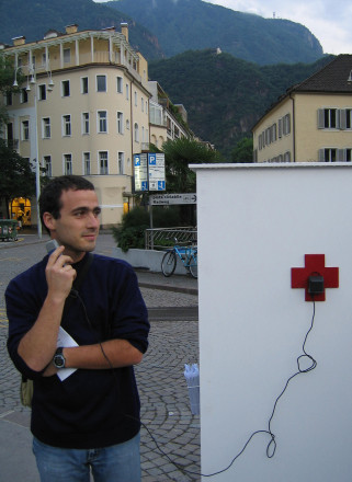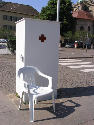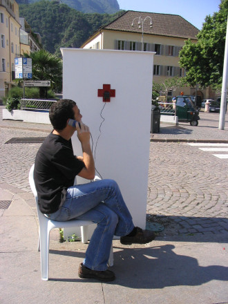 The Verissimo studio transfers the function of an electric socket from private to public space, making it accessible to passersby.The sockets take the shape of a red cross, and are placed on a column in both Piazza Walter and the bus station. The object makes reference to the First Aid sign and by doing so emphasizes its characteristic of emergency. Whoever needs electricity can plug in at these two points in the city.