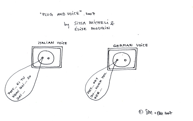 „Plug and voice“ sind drei „sprechende“ Steckdosen, die den öffentlichen Raum der Stadt mit einer Soundcollage bespielen. Die deutsch bzw. italienisch sprechenden Steckdosen machen die Passanten an drei Orten der Laubengasse durch Zurufe auf sich aufmerksam. Die Installation wird zu einem lockenden und ironischen Irritationsobjekt. „plug and voice“ verbindet die sichtbare, vordergründige Welt mit der unsichtbaren, geheimnisvollen.