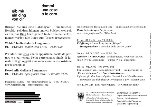 Currently Lungomare’s activities focus on long-term residency projects, a format whereby Lungomare invites guests to engage and interact within the context of South Tyrol. Lungomare’s activities are based on three principles: specific attention to the context in which the association’s projects are undertaken, the transdisciplinary approach that distinguishes these projects, and reflection on the role of Lungomare as a cultural institution in connection with the region in which it operates.