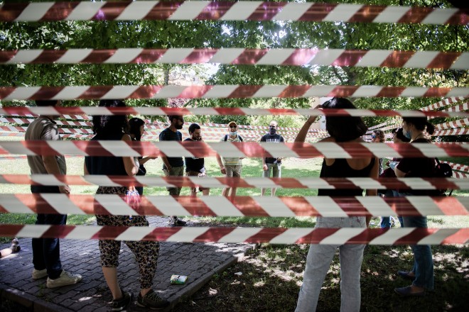 For several weeks now we have been entering and meeting each other again in the public spaces and coexisting with its new rules that regulate mechanisms of inclusion and exclusion. The laws are there to draw physical and spatial boundaries and to control our behaviour. Barrier tapes are used to limit public spaces from use and floor patterns determine our movements and our “protected zones”.