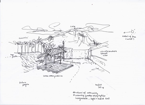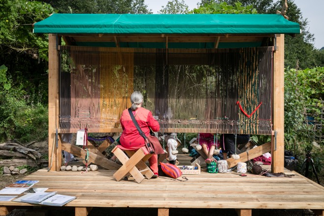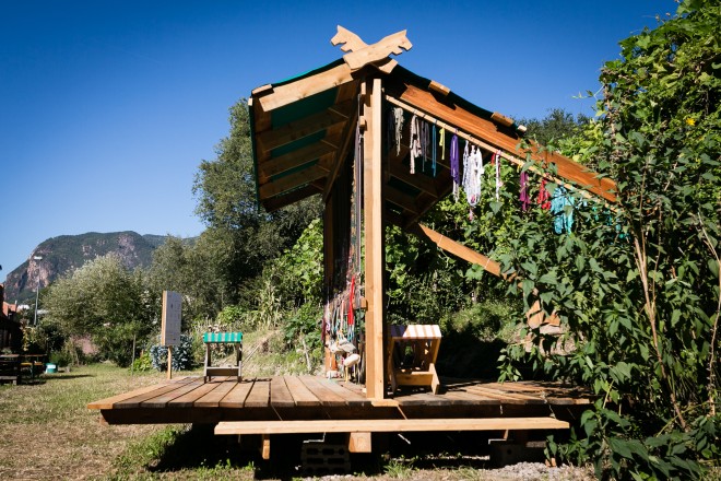On 22 September 2018, 2 – 6 pm, a permanent intervention was presented and inaugurated in the community garden Semirurali (Baristraße / corner Alessandriastraße, Bolzano). Visitors were invited to weave their personal stories and ideas of a garden on an outdoor loom using the inclusive technique of plain weave. The intentionally simplified loom is incorporated into a permanent structure that can also be used for other purposes (music podium, storage).