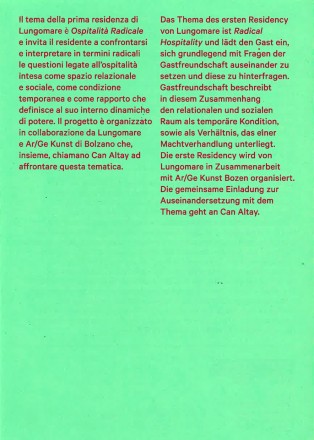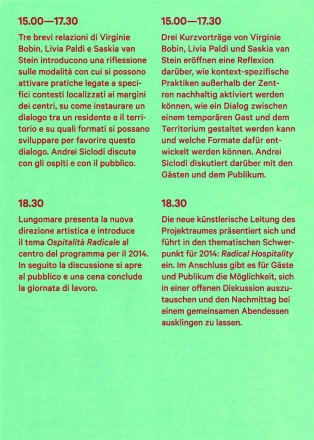 Lungomare introduces the new artistic direction and the Radical Hospitality theme which will be at the centre of the 2014 programme. It will be followed by a discussion with the public, and finally by a dinner.