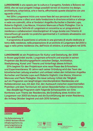 Lungomare, a cultural association founded in Bolzano in 2003, was created from the desire and necessity to open a space in which to share differences, experiences, opinions and desires, a space in which to make the link between cultural production and the political and social dimension. Lungomare undertakes projects that investigate and test possible relationships between design, architecture, urban planning, art and theory, the results of which are presented in different formats: public discussions, conferences, publications, exhibitions and interventions in public spaces. All these formats are characterised by the intention to interact with cultural and socio-political processes relating to the region in which Lungomare is located.